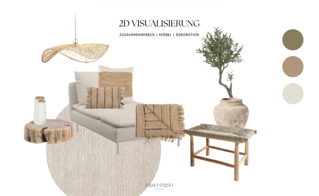 Basierend auf dem Moodboard entwickeln wir – je nach gebuchtem Paket – eine 2D- oder 3D-Visualisierung.